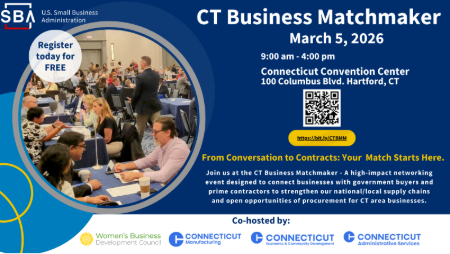 Join one of Connecticut’s most impactful business networking events of the year — the CT Business Matchmaker — a FREE, one-day opportunity to connect directly with government buyers, prime contractors, and key resource partners.